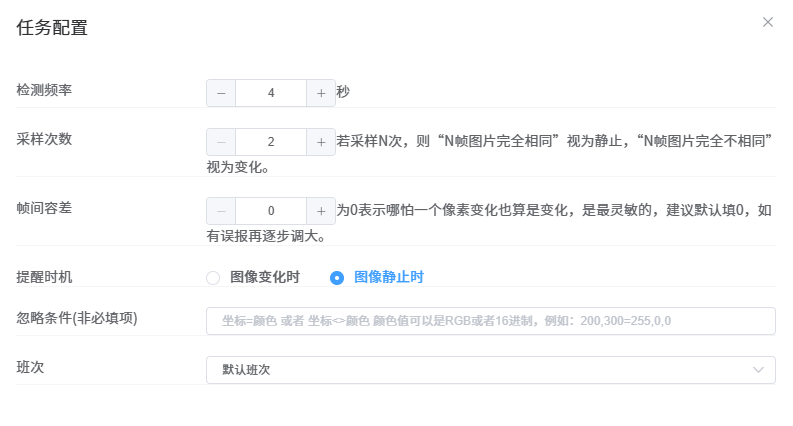 【4】区域变化监视模式:持续监视指定区域的图像变化,用户可自定义采样次数和变化敏感度阈值,以精准判定画面内容是否发生实质性改变。