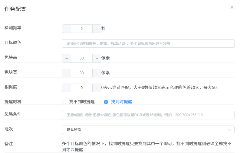 【2】找色模式:能在指定区域内搜寻一种或多种特定颜色,并支持设定目标色块的最小尺寸,以过滤干扰。