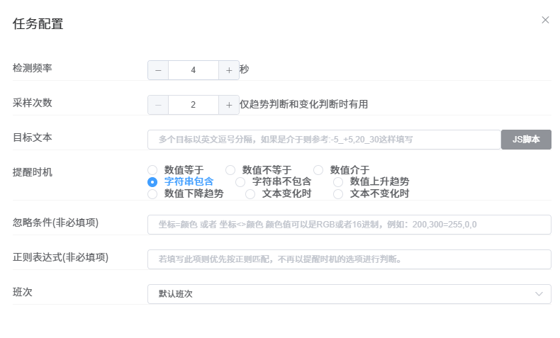 【3】找字模式(OCR文字识别):利用OCR技术识别屏幕指定区域的文字内容,并与用户设定的复杂条件进行比对。支持的条件包括数值等于/不等于、上升/下降趋势、字符串包含/不包含、文本是否变化等,并支持使用正则表达式进行高级模式匹配。